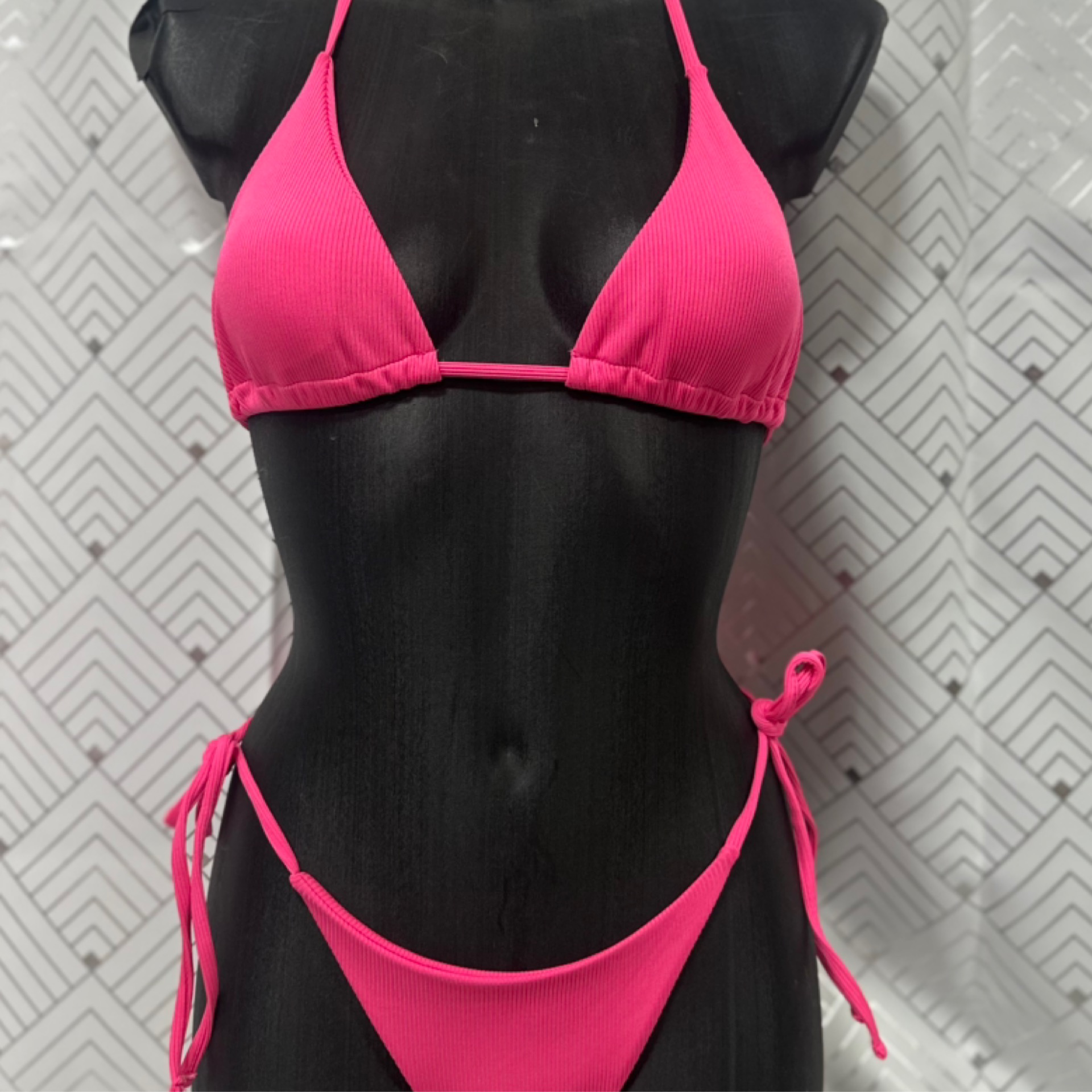 Maillot de bain deux-pièces rose vif avec texture léopard, coupe triangle avec liens ajustables